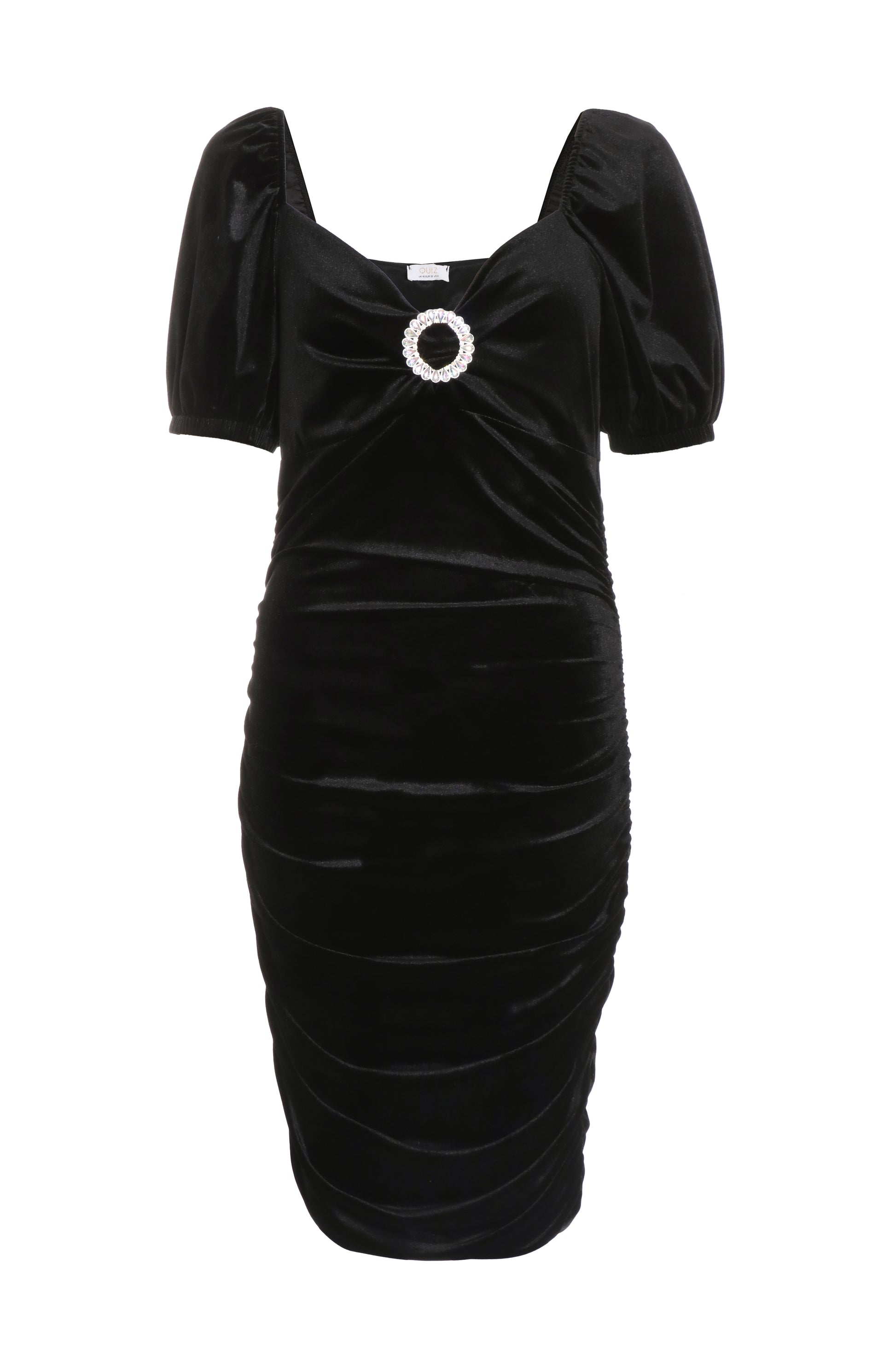 Black Velvet Diamanté Buckle Puff Sleeve Mini Dress